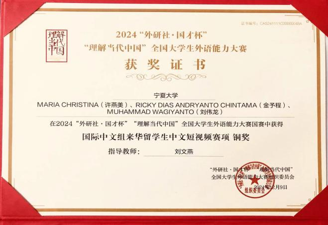 12月,由北京外国语大学和北京语言大学联合主办、外语教学与研究出版社承办的2024“理解当代中国”来华留学生中文短视频大赛全国总决赛又传喜讯,印度尼西亚留学生许燕美(MARIA CHRISTINA)、金予程(RICKY DIAS ANDRYANTO CHINTAMA)和2021级汉语言文学专业本科生刘伟龙(MUHAMMAD WAGIYANTO)团队的视频作品荣获大赛铜奖。天天影视