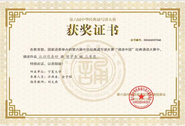 2023级语言学及应用语言学专业印度尼西亚研究生许燕美(MARIA CHRISTINA)、2021级汉语言文学专业本科生金予程(RICKY DIAS ANDRYANTO CHINTAMA)的参赛作品《认识你真好》经过层层选拔在“诵读中国”经典诵读大赛中荣获留学生组三等奖。2023级语言学及应用语言学专业土库曼斯坦研究生于果(TAJIYEV MEYLIS)的参赛作品《将进酒》入围全国总决赛。