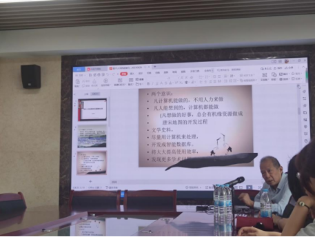 对王兆鹏教授的到来表示热烈欢迎。王兆鹏教授的讲座分“两个意识”“知识图谱的开发过程”“智能数据库的功能”三部分内容。