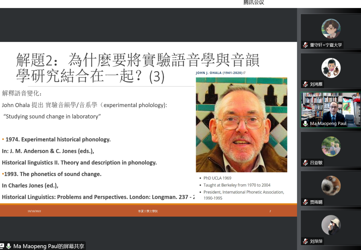 于腾讯会议平台举行了题为“实验语音学与音韵学研究”的学术讲座。本次讲座特邀香港岭南大学中国语文教学与测试中心高级讲师,陕西师范大学语言科学研究所兼职教授马毛朋博士主讲。讲座由天天影视