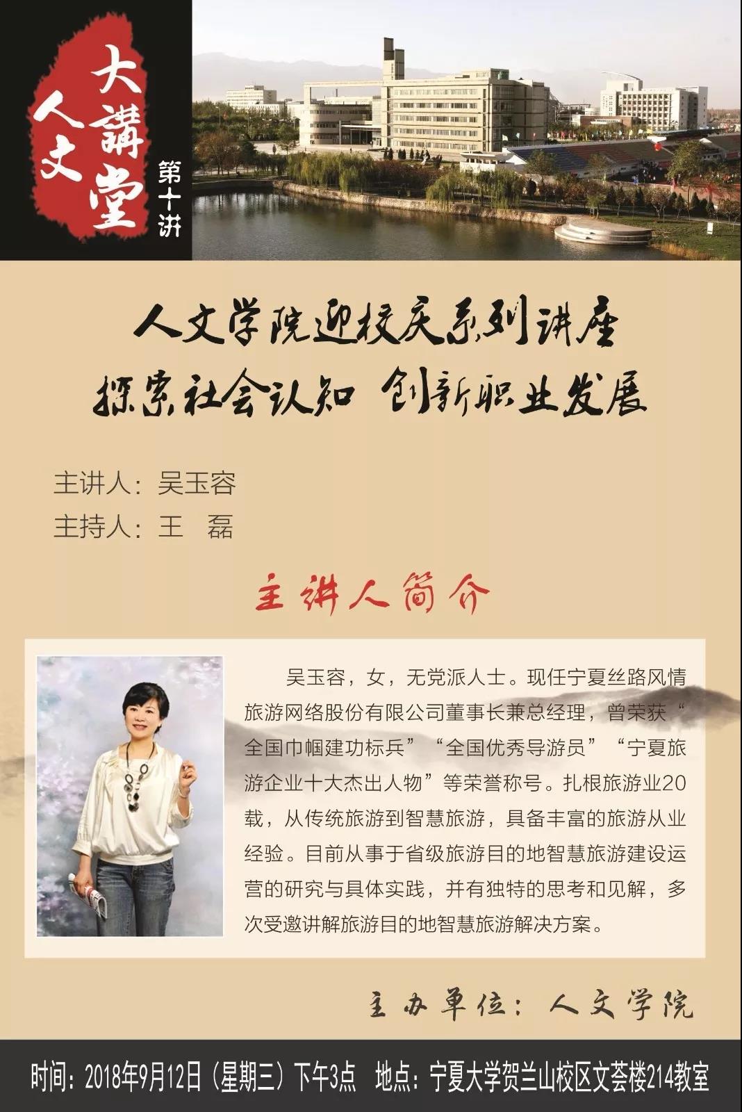 贺兰山校区文荟楼214教室顺利开讲。此次讲座由宁夏丝路风情旅游网络股份有限公司董事长兼总经理吴玉容主讲。