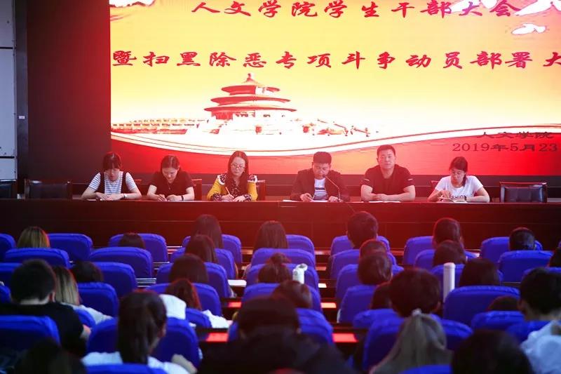 在贺兰山校区文荟楼东侧报告厅举行了学生干部大会暨扫黑除恶专项斗争动员部署大会。出席本次大会的有学院党委副书记马小军、研究生辅导员史春燕、本科生辅导员潘巍、研究生助管欧逸梅、郭家利、张倩。学院16、17、18级班委、宿舍长,团委、学生会、天天影视全体成员参加。
