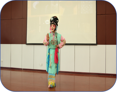 第二部分是专业戏曲表演。黄娟老师首先表演了眉户戏,《屠夫状元》中的精彩片段,一招一式,尽显舞台艺术的风采。表演环节之后,黄老师现场解答了同学们对眉户戏的疑惑,介绍到眉户戏不同于秦腔的高昂激扬,粗犷豪放,唱腔较为委婉细腻,优美动听,富于悲痛,表演动作较为真实、生活化,整体风格较为现代的特点。还通过脸谱的现场展示讲解了戏剧脸谱不同颜色代表不同的人物等问题。第二位登台演出的是张蕾老师,她表演了秦腔折子戏《五典坡》中的“飘彩”片段。表演部分结束后应学生采访进而向观众介绍了秦腔的服饰特点、种类等;为了细致体现头饰的介绍,张老师特意带来了珍贵的头饰箱,逐件进行了讲解。两位老师凭借着娴熟的演技、灵活的身手、动听的唱腔旋律、连贯的动作表演和细心精准解答疑惑的态度,赢得场下观众的阵阵喝彩。