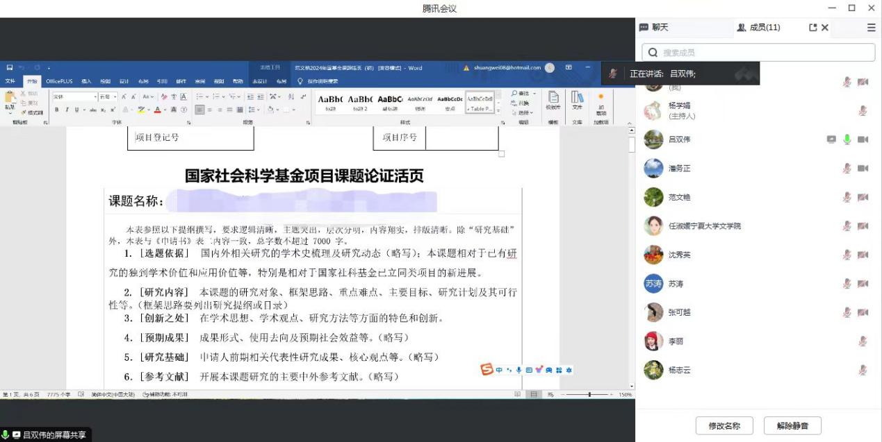 以线上会议的方式组织开展了2024年国家社会科学基金项目校外专家评审会,会议分为文学、语言学专场进行。此次评审会邀请吉林大学张丛皞教授、山东大学杨建刚教授、安徽师范大学潘务正教授、湖南师范大学吕双伟教授、辽宁师范大学杨春宇教授、杭州师范大学杨建忠教授作为评审专家,对天天影视